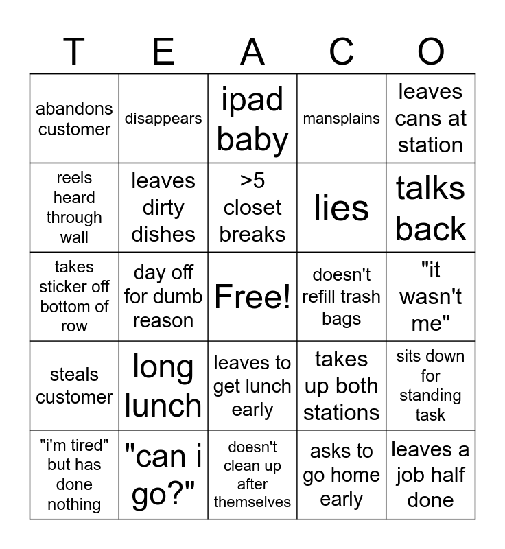 This bingo card has a free space and 42 words: in past 10, >5 closet breaks, tea break longer than 10 minutes, long lunch, asks to go home early, sits down for standing task, leaves a job half done, in back all day, ipad baby, leaves to get lunch early, "it wasn't me", talks back, day off for dumb reason, leaves cans at station, leaves can/bag open, takes up both stations, on phone w/ customers waiting, takes sticker off bottom of row, tea put on wrong shelf, disappears, reels heard through wall, nagged to do something, helps customer holding phone, abandons customer, leaves scoops on counter, asks question they ignore, lies, says they'll do something then doesn't, "why are you upset", gaslighting, indoor smoke break, steals customer, leaves dirty dishes, doesn't clean up after themselves, doesn't answer phone all day, "i'm tired" but has done nothing, "can i go?", doesn't refill trash bags, shows you tiktok in the middle of working, talks over you, mansplains and mentions gayness for relatability.