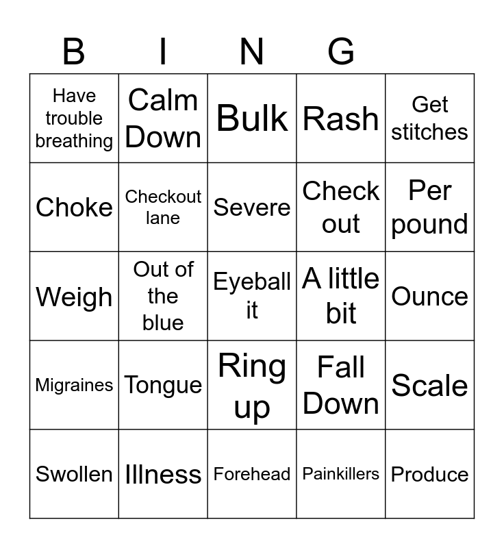 This bingo card has 25 words: Tongue, Forehead, Severe, Swollen, Get stitches, Have trouble breathing, Choke, Calm Down, A little bit, Ring up, Check out, Weigh, Fall Down, Scale, Checkout lane, Produce, Ounce, Bulk, Per pound, Out of the blue, Eyeball it, Illness, Migraines, Rash and Painkillers.