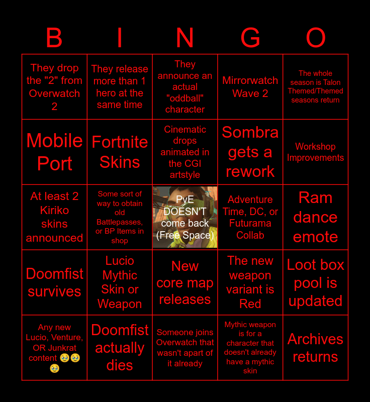 This bingo card has a free space and 24 words: Lucio Mythic Skin or Weapon, Doomfist actually dies, Cinematic drops animated in the CGI artstyle, Any new Lucio, Venture, OR Junkrat content 🥹🥹🥹, The whole season is Talon Themed/Themed seasons return, They drop the "2" from Overwatch 2, Mobile Port, They release more than 1 hero at the same time, Adventure Time, DC, or Futurama Collab, New core map releases, Sombra gets a rework, At least 2 Kiriko skins announced, The new weapon variant is Red, Loot box pool is updated, Fortnite Skins, Mythic weapon is for a character that doesn't already have a mythic skin, Ram dance emote, They announce an actual "oddball" character, Workshop Improvements, Some sort of way to obtain old Battlepasses, or BP Items in shop, Archives returns, Doomfist survives, Mirrorwatch Wave 2 and Someone joins Overwatch that wasn't apart of it already.