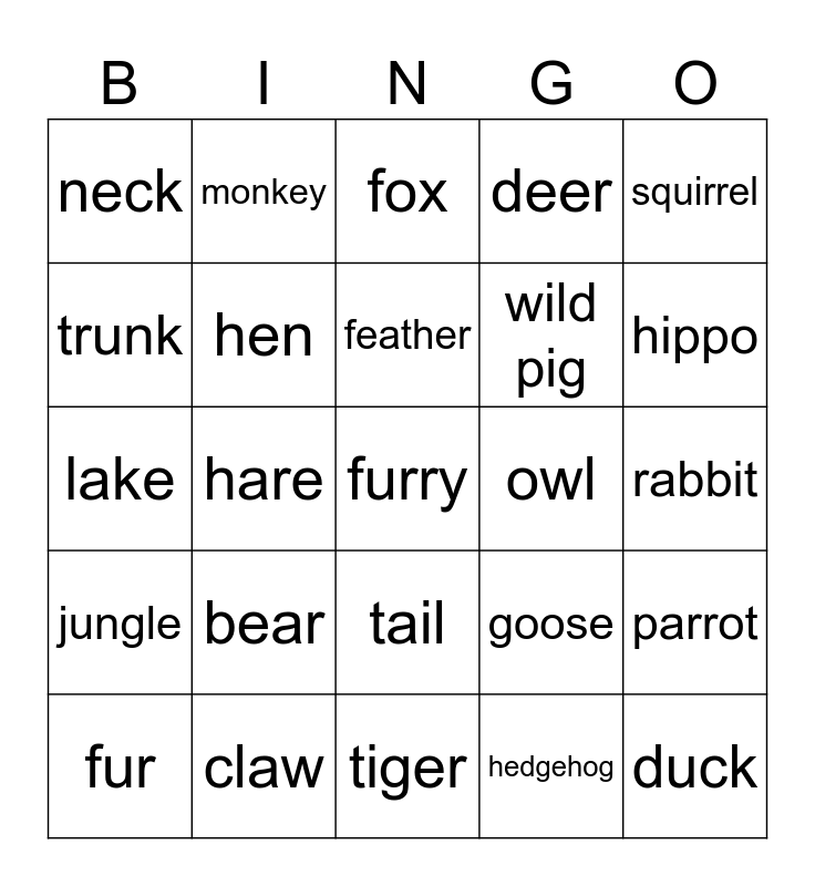This bingo card has a free space and 24 words: bear, claw, feather, fur, squirrel, neck, trunk, monkey, owl, tail, wild pig, lake, goose, parrot, hen, hedgehog, rabbit, fox, hippo, hare, duck, jungle, deer and tiger.