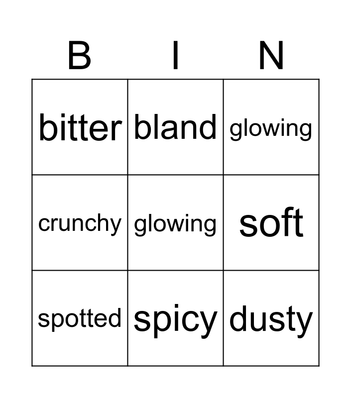 This bingo card has 12 words: gooey, spicy, dusty, crunchy, bland, soft, spotted, rotten, glowing, bitter, glowing and spotted.