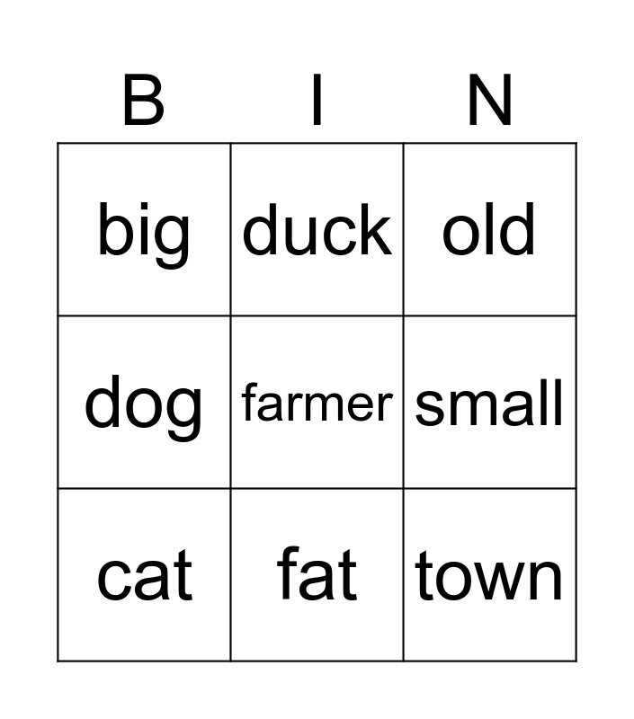 This bingo card has 13 words: Free!, donkey, cat, duck, dog, farmer, town, thin, fat, big, small, old and young.