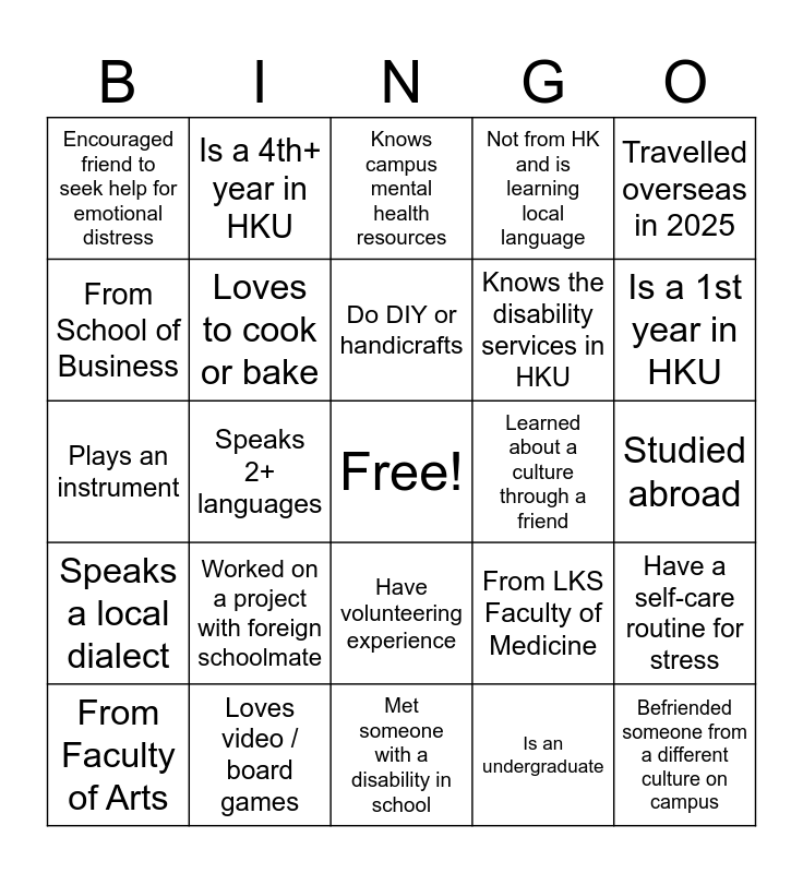 This bingo card has a free space and 41 words: Does regular physical exercise, Plays an instrument, Watches movie regularly, Loves to cook or bake, Loves video / board games, Have volunteering experience, Do DIY or handicrafts, Is a vegetarian / vegan, Travelled overseas in 2025, Speaks a local dialect, Speaks 2+ languages, Not from HK and is learning local language, Befriended someone from a different culture on campus, Studied abroad, Learned about a culture through a friend, Worked on a project with foreign schoolmate, Helped a foreign schoolmate to adapt to life in HK, Encouraged friend to seek help for emotional distress, Supported a friend through a tough time, Knows campus mental health resources, Have a self-care routine for stress, Practices daily meditation or kept a mood journal, Met someone with a disability in school, Knows the disability services in HKU, Collaborated with a classmate with disability, Attended a disability awareness workshop, Is an undergraduate, Is a postgraduate, Is a 1st year in HKU, Is a 2nd year in HKU, Is a 3rd year in HKU, Is a 4th+ year in HKU, From Faculty of Arts, From Faculty of Social Sciences, From LKS Faculty of Medicine, From School of Business, From Faculty of Engineering, From Faculty of Education, From Faculty of Science, From Faculty of Law and From Faculty of Architecture.