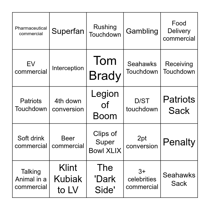 This bingo card has 25 words: Beer commercial, The 'Dark Side', Tom Brady, Talking Animal in a commercial, Food Delivery commercial, Pharmaceutical commercial, EV commercial, Superfan, D/ST touchdown, Clips of Super Bowl XLIX, Seahawks Touchdown, Patriots Touchdown, 2pt conversion, Penalty, Interception, Seahawks Sack, Patriots Sack, Rushing Touchdown, Receiving Touchdown, 4th down conversion, Legion of Boom, Klint Kubiak to LV, Soft drink commercial, Gambling and 3+ celebrities commercial.