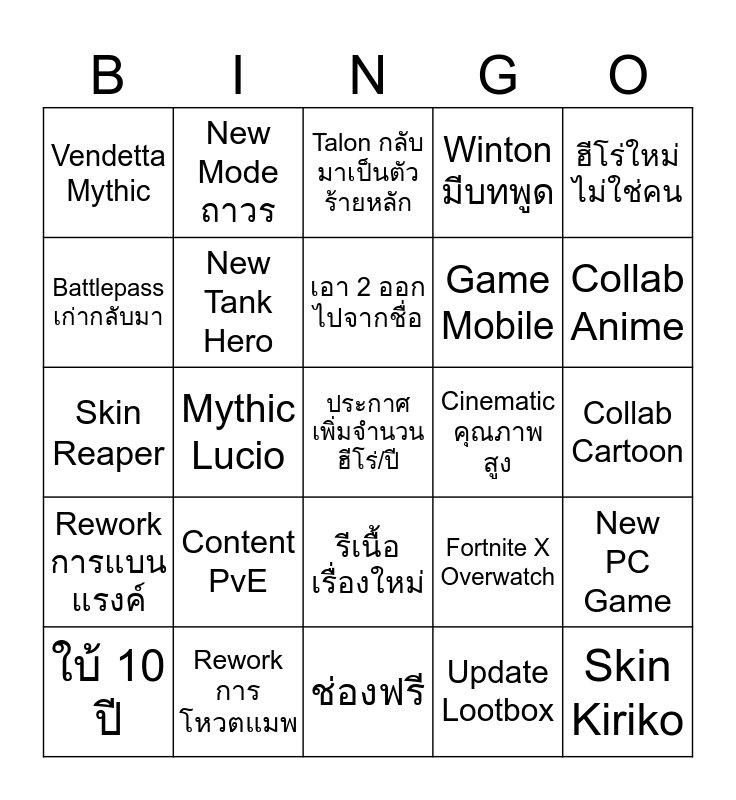This bingo card has 25 words: Rework การแบนแรงค์, Rework การ โหวตแมพ, ประกาศเพิ่มจำนวนฮีโร่/ปี, Update Lootbox, ฮีโร่ใหม่ไม่ใช่คน, Vendetta Mythic, New Mode ถาวร, Talon กลับมาเป็นตัวร้ายหลัก, Cinematic คุณภาพสูง, New PC Game, Battlepass เก่ากลับมา, New Tank Hero, ช่องฟรี, Fortnite X Overwatch, Collab Anime, ใบ้ 10 ปี, Mythic Lucio, เอา 2 ออกไปจากชื่อ, Game Mobile, Collab Cartoon, Skin Reaper, Content PvE, รีเนื้อเรื่องใหม่, Winton มีบทพูด and Skin Kiriko.