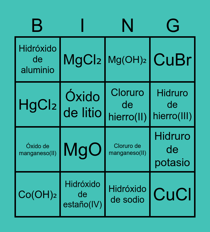 This bingo card has 101 words: ZnCl₂, AgOH, HgCl₂, FeBr₂, AlCl₃, KOH, CuCl₂, Ca(OH)₂, PbO₂, CuBr₂, KBr, SnCl₄, Sn(OH)₂, NaCl, HgO, MgH₂, CuCl, Pb(OH)₂, Co(OH)₃, KI, Sr(OH)₂, CrCl₂, LiCl, BaH₂, CaCl₂, MgO, CuBr, Co₂O₃, LiI, Mn(OH)₂, MgCl₂, Mg(OH)₂, CuO, Cr(OH)₂, Hg₂Cl₂, Fe₂O₃, Fe(OH)₂, Cr(OH)₃, MgI₂, Al₂O₃, CuOH, Na₂O, Cu₂O, CaI₂, Zn(OH)₂, Co(OH)₂, MnO₂, LiH, PbCl₂, Óxido de calcio, Hidróxido de bario, Óxido de litio, Hidróxido de hierro(III), Óxido de hierro(II), Cloruro de hierro(III), Hidruro de aluminio, Óxido de cromo(VI), Hidruro de calcio, Óxido de plomo(II), Óxido de zinc, Cloruro de hierro(II), Cloruro de cobalto(II), Óxido de cromo(II), Bromuro de plata, Hidróxido de mercurio(II), Óxido de manganeso(II), Cloruro de níquel(II), Hidruro de potasio, Cloruro de plata, Hidruro de hierro(II), Yoduro de zinc, Óxido de bario, Hidróxido de aluminio, Óxido de estaño(IV), Hidruro de hierro(III), Cloruro de manganeso(II), Yoduro de plomo(II), Hidruro de estroncio, Hidróxido de níquel(II), Óxido de plata, Hidróxido de cobre(II), Óxido de estroncio, Hidróxido de estaño(IV), Cloruro de potasio, Bromuro de calcio, Yoduro de plata, Hidróxido de sodio, Hidróxido de litio, Hidróxido de manganeso(IV), Óxido de níquel(II), Cloruro de estroncio, Bromuro de hierro(III), Bromuro de sodio, Yoduro de sodio, Óxido de cromo(III), Hidruro de sodio, Cloruro de bario, Óxido de estaño(II), Óxido de potasio, Cloruro de estaño(II) and Óxido de cobalto(II).