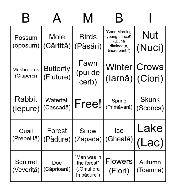 This bingo card has a free space and 24 words: Forest (Pădure), Doe (Căprioară), Fawn (pui de cerb), Squirrel (Veveriţă), Nut (Nuci), Possum (oposum), Mushrooms (Ciuperci), Mole (Cârtiță), Spring (Primăvară), Snow (Zăpadă), Winter (Iarnă), Rabbit (Iepure), Ice (Gheaţă), Lake (Lac), Butterfly (Fluture), Flowers (Flori), Skunk (Sconcs), Birds (Păsări), Crows (Ciori), Waterfall (Cascadă), Autumn (Toamnă), Quail (Prepeliţă), "Good Morning, young prince!" („Bună dimineața, tinere prinț!”) and "Man was in the forest" („Omul era în pădure”).