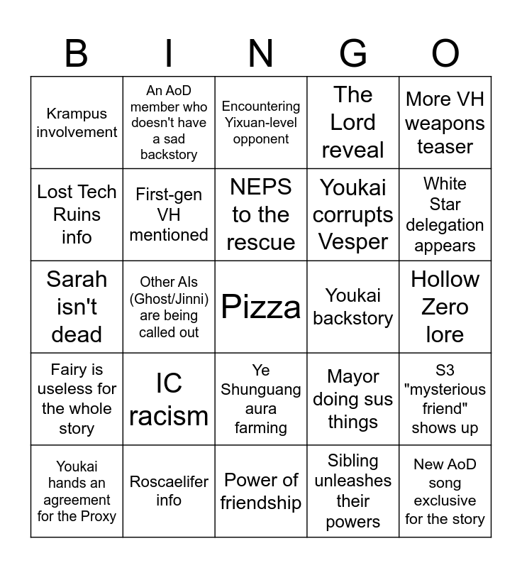 This bingo card has a free space and 24 words: IC racism, Roscaelifer info, NEPS to the rescue, Youkai hands an agreement for the Proxy, More VH weapons teaser, Krampus involvement, Lost Tech Ruins info, An AoD member who doesn't have a sad backstory, Youkai backstory, Ye Shunguang aura farming, Youkai corrupts Vesper, Sarah isn't dead, Mayor doing sus things, S3 "mysterious friend" shows up, First-gen VH mentioned, Sibling unleashes their powers, Hollow Zero lore, Encountering Yixuan-level opponent, White Star delegation appears, Other AIs (Ghost/Jinni) are being called out, New AoD song exclusive for the story, Fairy is useless for the whole story, The Lord reveal and Power of friendship.