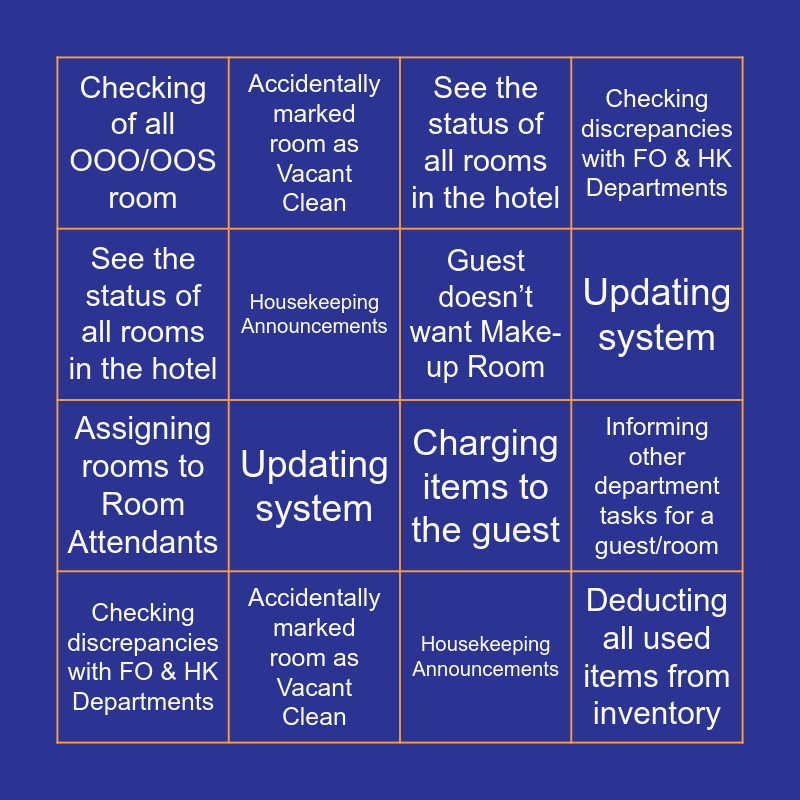 This bingo card has 31 words: Viewing list of rooms with special requests to prioritize, Cannot print anything from iKeep, Informing other department tasks for a guest/room, Deducting all used items from inventory, Checking of all OOO/OOS room, See the status of all rooms in the hotel, Guest doesn’t want Make-up Room, Cannot mark room as Vacant Inspected, Accidentally marked room as Vacant Clean, Assigning rooms to Room Attendants, Housekeeping Announcements, Checking discrepancies with FO & HK Departments, Charging items to the guest, Cannot login, Updating system, Viewing list of rooms with special requests to prioritize, Cannot print anything from iKeep, Informing other department tasks for a guest/room, Deducting all used items from inventory, Checking of all OOO/OOS room, See the status of all rooms in the hotel, Guest doesn’t want Make-up Room, Cannot mark room as Vacant Inspected, Accidentally marked room as Vacant Clean, Assigning rooms to Room Attendants, Housekeeping Announcements, Checking discrepancies with FO & HK Departments, Charging items to the guest, Cannot login, Updating system and Cannot print a report.