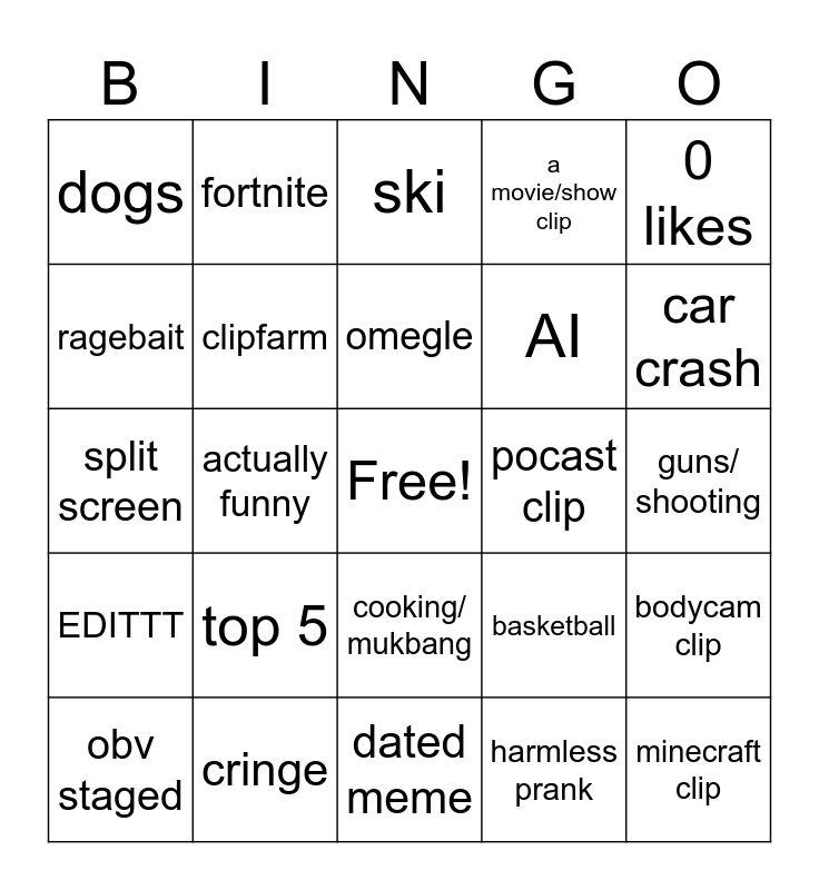 This bingo card has a free space and 24 words: top 5, cringe, omegle, obv staged, 0 likes, dogs, ragebait, fortnite, pocast clip, cooking/ mukbang, AI, split screen, basketball, bodycam clip, clipfarm, harmless prank, guns/ shooting, ski, car crash, actually funny, minecraft clip, EDITTT, a movie/show clip and dated meme.