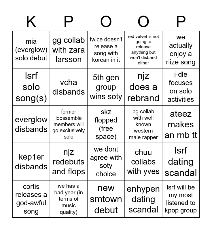 This bingo card has a free space and 24 words: njz redebuts and flops, ive has a bad year (in terms of music quality), 5th gen group wins soty, cortis releases a god-awful song, we actually enjoy a riize song, mia (everglow) solo debut, lsrf solo song(s), gg collab with zara larsson, bg collab with well known western male rapper, we dont agree with soty choice, njz does a rebrand, everglow disbands, chuu collabs with yves, lsrf dating scandal, vcha disbands, enhypen dating scandal, ateez makes an rnb tt, twice doesn't release a song with korean in it, i-dle focuses on solo activities, former loossemble members will go exclusively solo, lsrf will be my most listened to kpop group, kep1er disbands, red velvet is not going to release anything but won't disband either and new smtown debut.