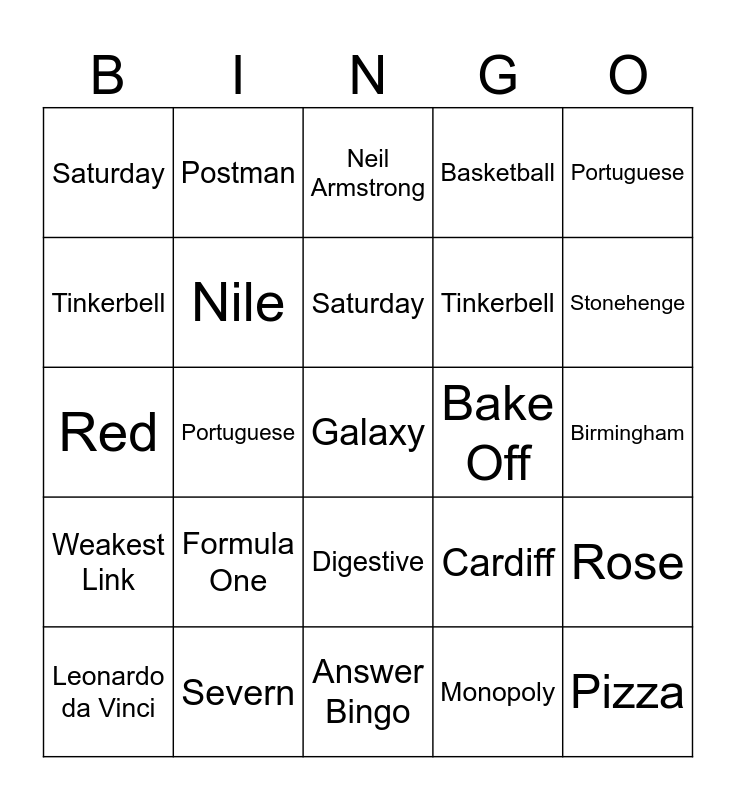 This bingo card has 92 words: Free!, Bingo, Answer Bingo, 25 Q's each paper has different answers etc..., Jupiter, Japan, Carbon Dioxide, Leonardo da Vinci, Giraffe, Edinburgh, Au, Piano, Pride, Tinkerbell, Seven, Portuguese, Neil Armstrong, Pacific, Herbivores, Mercury, Madrid, Monopoly, Mars, Holmes, Formula One, Nile, Femur, Pizza, Basketball, Wheel of Fortune, Severn, Digestive, Rose, The Tube, Postman, NHS, Sandcastles, Bake Off, Saturday, Cardiff, Red, Weakest Link, Birmingham, Airport, Galaxy, Peppa Pig, Stonehenge, Lion, Jupiter, Japan, Carbon Dioxide, Leonardo da Vinci, Giraffe, Edinburgh, Au, Piano, Pride, Tinkerbell, Seven, Portuguese, Neil Armstrong, Pacific, Herbivores, Mercury, Madrid, Monopoly, Mars, Holmes, Formula One, Nile, Femur, Pizza, Basketball, Wheel of Fortune, Severn, Digestive, Rose, The Tube, Postman, NHS, Sandcastles, Bake Off, Saturday, Cardiff, Red, Weakest Link, Birmingham, Airport, Galaxy, Peppa Pig, Stonehenge and Lion.