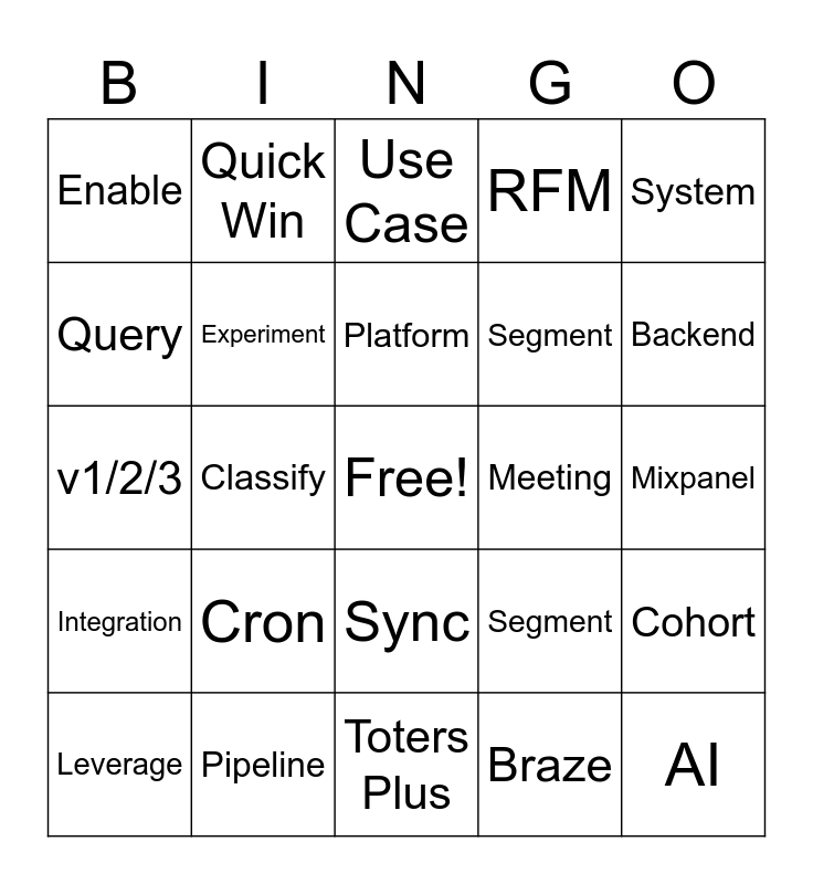 This bingo card has a free space and 24 words: Cron, Pipeline, Platform, Leverage, System, Enable, Query, Quick Win, Meeting, Sync, Segment, v1/2/3, Segment, Cohort, Experiment, Braze, Mixpanel, Use Case, Backend, Classify, AI, Integration, RFM and Toters Plus.