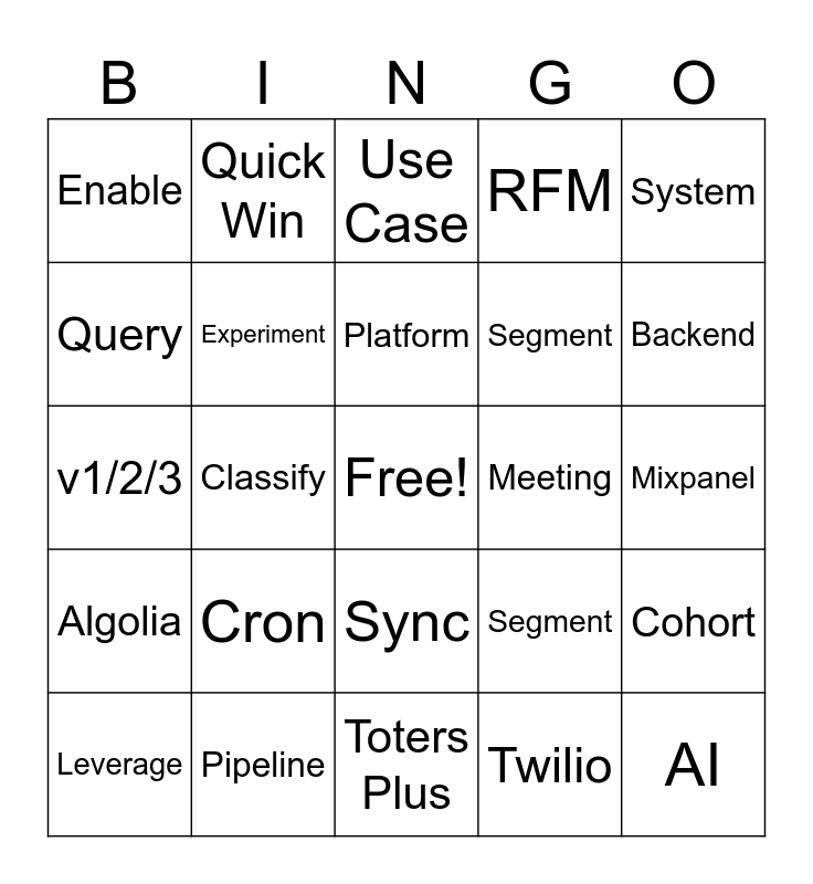 This bingo card has a free space and 24 words: Cron, Pipeline, Platform, Leverage, System, Enable, Query, Quick Win, Meeting, Sync, Segment, v1/2/3, Segment, Cohort, Experiment, Twilio, Mixpanel, Use Case, Backend, Classify, AI, Algolia, RFM and Toters Plus.