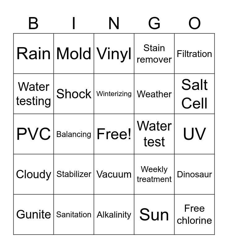 This bingo card has a free space and 51 words: Salt system, Free chlorine, Ph, Alkalinity, Stabilizer, Algae, Mold, Per 10,000 gallons, Water testing, Metal, Shock, Stain remover, Dinosaur, Weekly treatment, Calcium, Phosphates, Winterizing, Water test, Cleariflier, Filtration, Balancing, Sun, Rain, Weather, Cold, PPE, Salt Cell, Heater, Gunite, Vinyl, Fiberglass, Hardness, Evaporation, Corrosion, Granules, Sanitation, Test strips, Water Sample, Balanced, Backwash, UV, Cloudy, Green, Bromine, Pump, Chlorinator, PVC, Skimmer, Super Chlorinate, Vacuum and Brush.