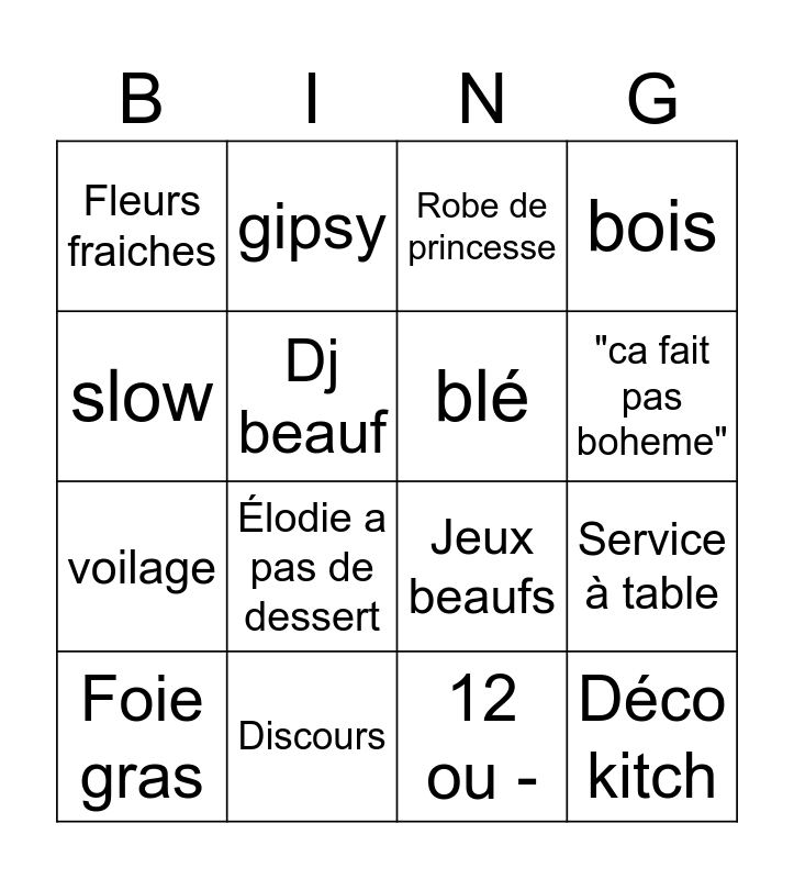 This bingo card has 16 words: Discours, Service à table, Robe de princesse, Fleurs fraiches, voilage, gipsy, Jeux beaufs, 12 ou -, slow, Dj beauf, Foie gras, bois, Élodie a pas de dessert, "ca fait pas boheme", blé and Déco kitch.