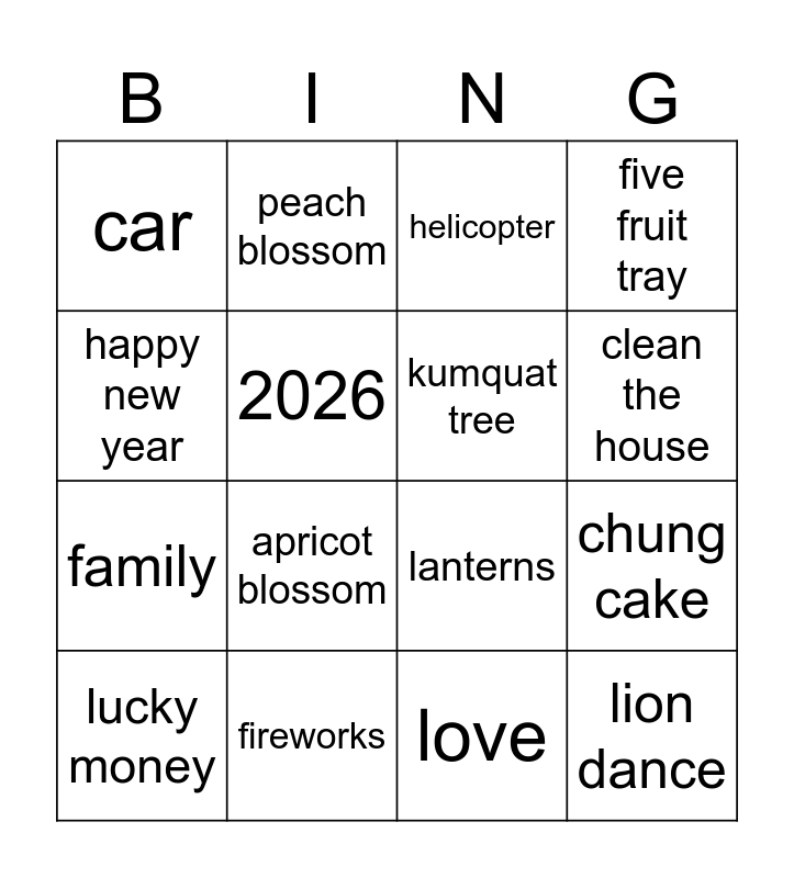 This bingo card has 16 words: fireworks, chung cake, helicopter, car, family, peach blossom, lanterns, love, happy new year, 2026, lucky money, five fruit tray, apricot blossom, clean the house, kumquat tree and lion dance.