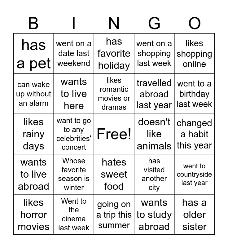 This bingo card has a free space and 24 words: Whose favorite season is winter, Went to the cinema last week, likes romantic movies or dramas, likes horror movies, likes shopping online, has a pet, can wake up without an alarm, went on a date last weekend, doesn't like animals, hates sweet food, travelled abroad last year, likes rainy days, has visited another city, went to countryside last year, wants to live here, wants to study abroad, changed a habit this year, has favorite holiday, went to a birthday last week, want to go to any celebrities' concert, has a older sister, wants to live abroad, went on a shopping last week and going on a trip this summer.