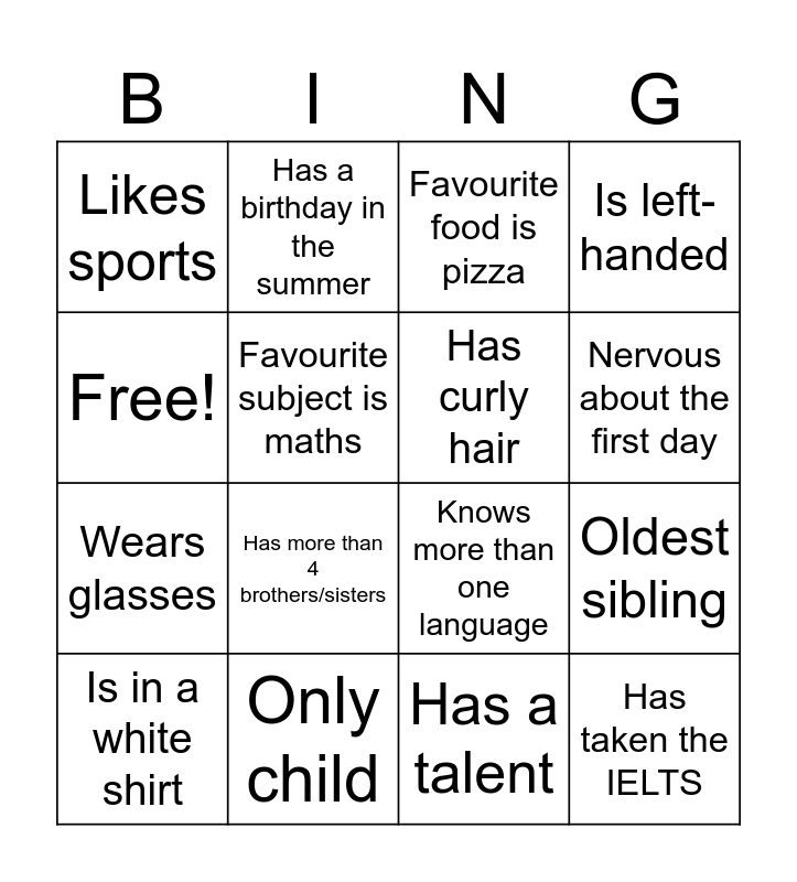 This bingo card has 16 words: Only child, Oldest sibling, Favourite food is pizza, Likes sports, Wears glasses, Has a birthday in the summer, Knows more than one language, Has a talent, Free!, Favourite subject is maths, Is in a white shirt, Is left-handed, Has more than 4 brothers/sisters, Nervous about the first day, Has curly hair and Has taken the IELTS.