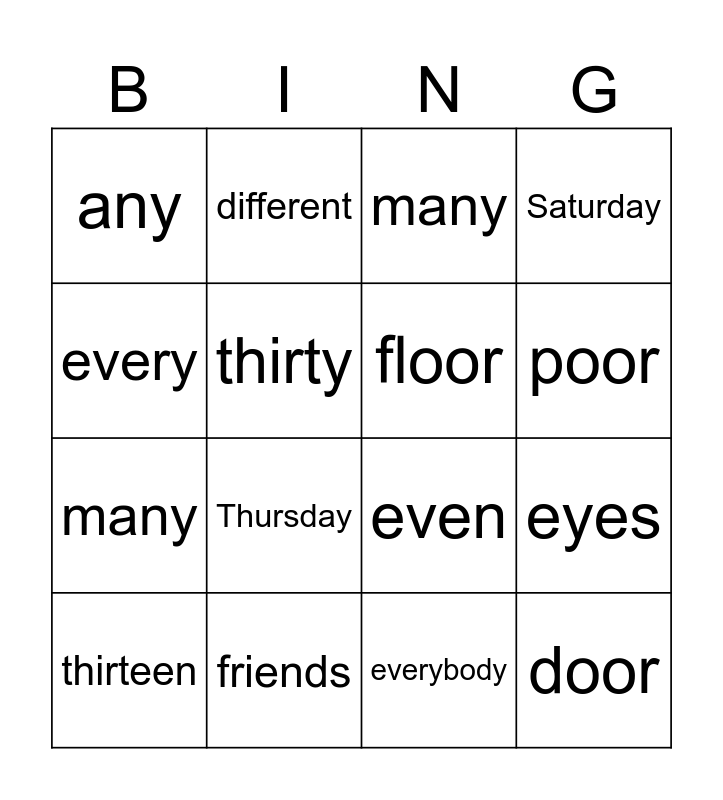 This bingo card has 16 words: friends, eyes, many, any, many, different, even, everybody, every, thirty, thirteen, Saturday, Thursday, poor, floor and door.