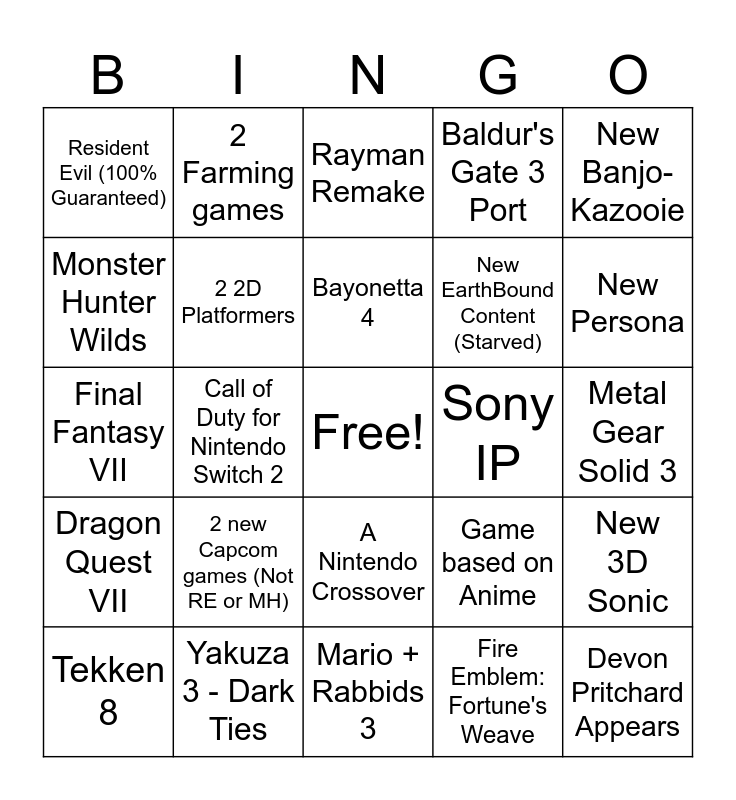 This bingo card has a free space and 24 words: Tekken 8, 2 new Capcom games (Not RE or MH), Bayonetta 4, Fire Emblem: Fortune's Weave, New Banjo-Kazooie, Resident Evil (100% Guaranteed), 2 Farming games, Rayman Remake, Sony IP, Metal Gear Solid 3, Final Fantasy VII, 2 2D Platformers, Game based on Anime, New 3D Sonic, Monster Hunter Wilds, Yakuza 3 - Dark Ties, Mario + Rabbids 3, Baldur's Gate 3 Port, New Persona, Dragon Quest VII, Call of Duty for Nintendo Switch 2, A Nintendo Crossover, New EarthBound Content (Starved) and Devon Pritchard Appears.