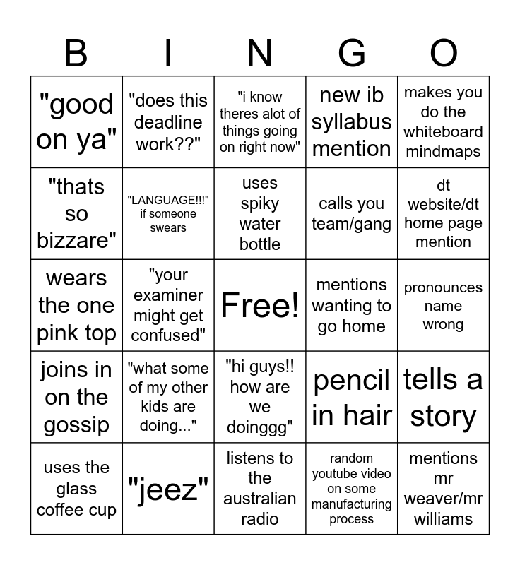 This bingo card has a free space and 24 words: "what some of my other kids are doing...", "jeez", uses spiky water bottle, uses the glass coffee cup, makes you do the whiteboard mindmaps, "good on ya", "thats so bizzare", "does this deadline work??", mentions wanting to go home, "hi guys!! how are we doinggg", calls you team/gang, wears the one pink top, pencil in hair, tells a story, "LANGUAGE!!!" if someone swears, random youtube video on some manufacturing process, pronounces name wrong, "i know theres alot of things going on right now", dt website/dt home page mention, "your examiner might get confused", mentions mr weaver/mr williams, joins in on the gossip, new ib syllabus mention and listens to the australian radio.