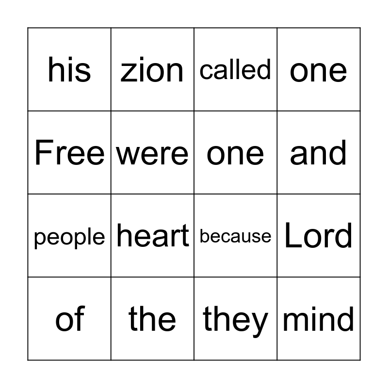 This bingo card has 16 words: the, Lord, called, his, people, zion, because, they, Free, were, of, one, heart, and, one and mind.