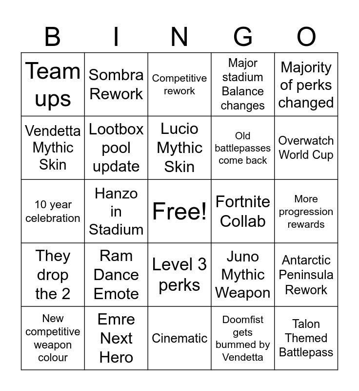This bingo card has a free space and 24 words: Ram Dance Emote, Emre Next Hero, Lucio Mythic Skin, New competitive weapon colour, Majority of perks changed, Team ups, Vendetta Mythic Skin, Sombra Rework, Fortnite Collab, Level 3 perks, Old battlepasses come back, 10 year celebration, Juno Mythic Weapon, Antarctic Peninsula Rework, Lootbox pool update, Doomfist gets bummed by Vendetta, More progression rewards, Competitive rework, Overwatch World Cup, Hanzo in Stadium, Talon Themed Battlepass, They drop the 2, Major stadium Balance changes and Cinematic.