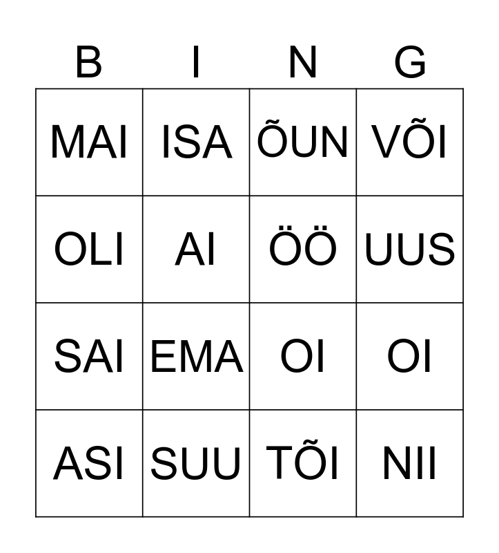 This bingo card has 16 words: SUU, OI, ÕUN, MAI, SAI, ISA, OI, TÕI, OLI, AI, ASI, VÕI, EMA, UUS, ÖÖ and NII.