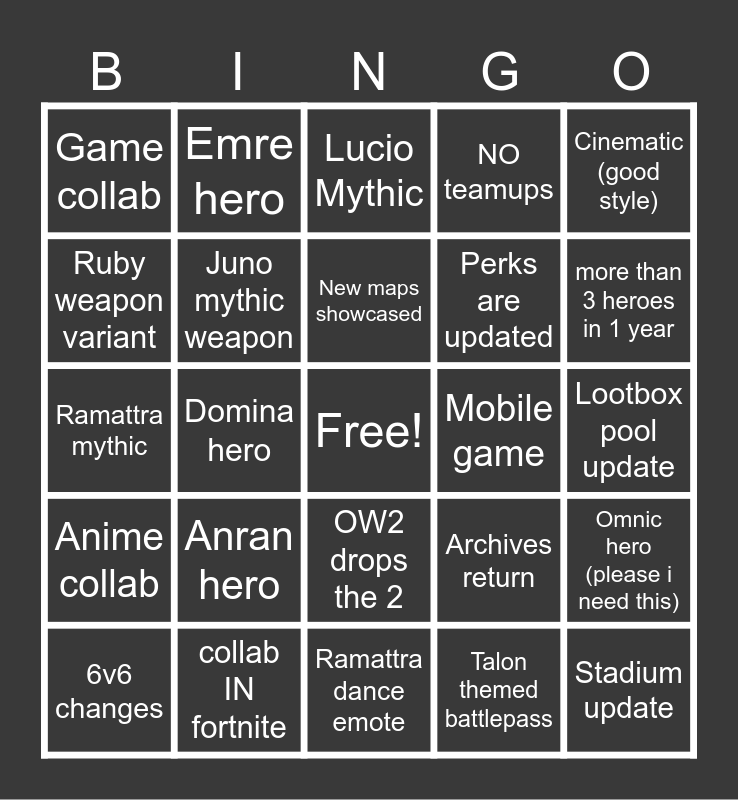 This bingo card has a free space and 24 words: Anran hero, collab IN fortnite, New maps showcased, 6v6 changes, Cinematic (good style), Game collab, Ruby weapon variant, Emre hero, Mobile game, OW2 drops the 2, Perks are updated, Ramattra mythic, Archives return, Omnic hero (please i need this), Juno mythic weapon, Talon themed battlepass, Lootbox pool update, Lucio Mythic, more than 3 heroes in 1 year, Domina hero, Stadium update, Anime collab, NO teamups and Ramattra dance emote.