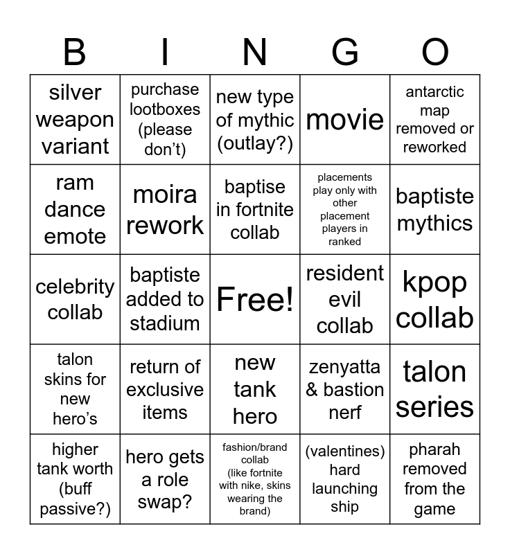 This bingo card has a free space and 24 words: return of exclusive items, hero gets a role swap?, baptise in fortnite collab, higher tank worth (buff passive?), antarctic map removed or reworked, silver weapon variant, ram dance emote, purchase lootboxes (please don’t), resident evil collab, new tank hero, placements play only with other placement players in ranked, celebrity collab, zenyatta & bastion nerf, talon series, moira rework, (valentines) hard launching ship, kpop collab, new type of mythic (outlay?), baptiste mythics, baptiste added to stadium, pharah removed from the game, talon skins for new hero’s, movie and fashion/brand collab (like fortnite with nike, skins wearing the brand).