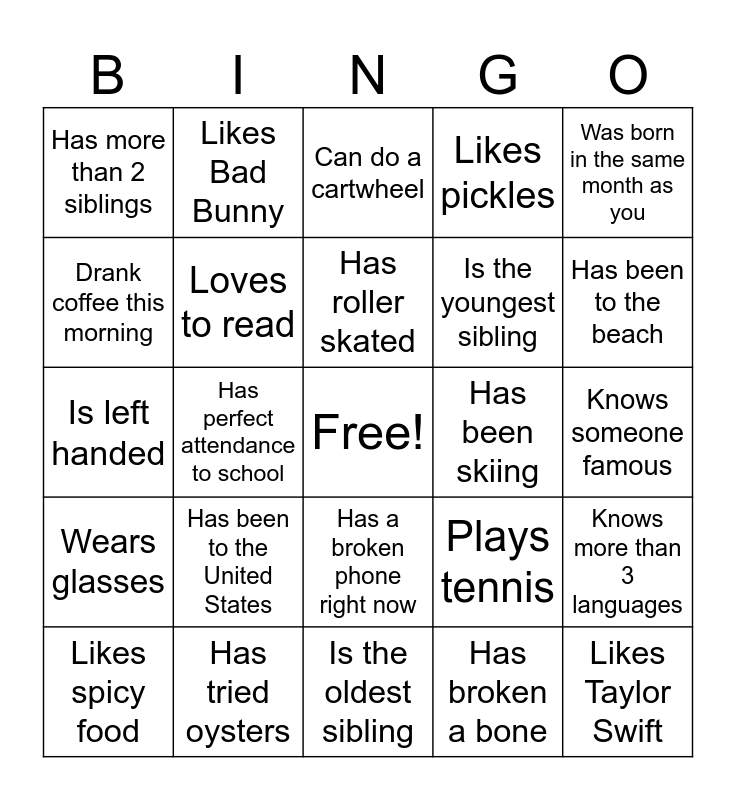 This bingo card has a free space and 24 words: Has been to the United States, Has tried oysters, Has roller skated, Likes spicy food, Was born in the same month as you, Has more than 2 siblings, Drank coffee this morning, Likes Bad Bunny, Has been skiing, Has a broken phone right now, Is the youngest sibling, Is left handed, Plays tennis, Knows more than 3 languages, Loves to read, Has broken a bone, Knows someone famous, Can do a cartwheel, Has been to the beach, Has perfect attendance to school, Likes Taylor Swift, Wears glasses, Likes pickles and Is the oldest sibling.