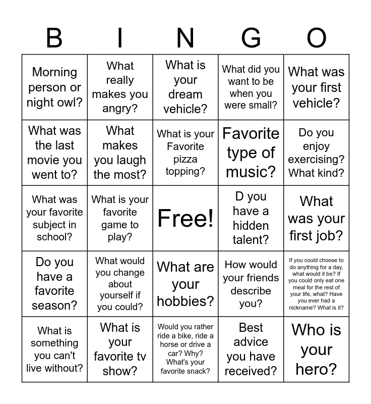 This bingo card has a free space and 47 words: What is your favorite game or sport to play or watch?, Who is your hero?, If you could live anywhere, where would it be?, Would you rather ride a bike, ride a horse or drive a car? Why? What's your favorite snack?, What would you change about yourself if you could?, What is your biggest fear?, What really makes you angry?, What's your favorite subject?, What was the last movie you went to?, What motivates you to work hard?, What makes you laugh the most?, What did you want to be when you were small?, If you could choose to do anything for a day, what would it be? If you could only eat one meal for the rest of your life, what? Have you ever had a nickname? What is it?, How would your friends describe you?, Do you like or dislike surprises? Why or why not?, If money was no object, what would you do all day?, What is your Favorite pizza topping?, D you have a hidden talent?, When did you feel most proud?, What was your first vehicle?, What is your favorite game to play?, Best advice you have received?, Morning person or night owl?, Favorite type of music?, What is your favorite restaurant?, Do you enjoy exercising? What kind?, What is something you can't live without?, One thing you would take to a deserted island?, What are your hobbies?, Do you have a favorite season?, Have you been to a concert?, What is your favorite way to relax?, Most memorable birthday, What was the last movie you watched?, Where is the farthest you have a traveled?, What is your favorite tv show?, What was your first job?, Do you play any musical instruments?, Sweet, savory, or sour?, Did you have a nickname when you were a child?, Name one thing on your bucket list, What is your dream vehicle?, What was your favorite subject in school?, A skill you would like to learn?, Coffee or Tea?, What is something you hate doing? Why? and Have you ever won a contest?.