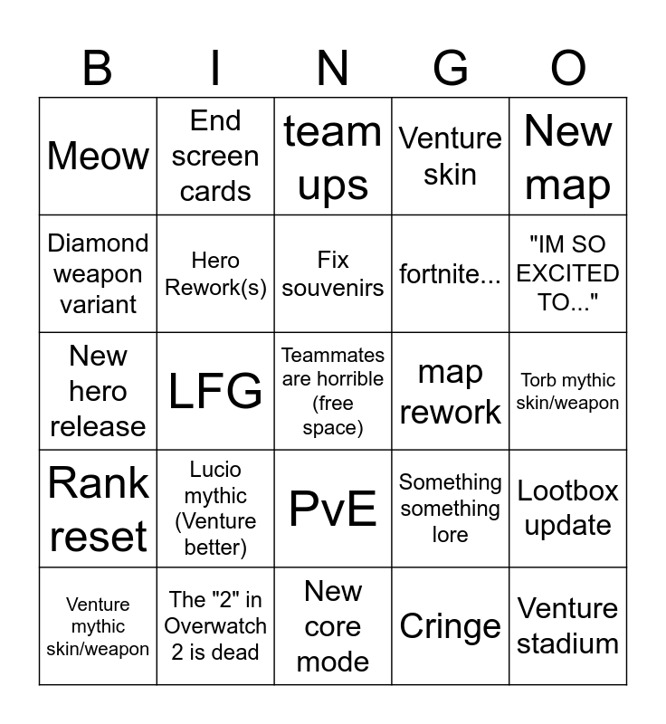 This bingo card has a free space and 24 words: Venture mythic skin/weapon, Lucio mythic (Venture better), Fix souvenirs, Cringe, New map, Meow, End screen cards, team ups, map rework, Torb mythic skin/weapon, New hero release, Hero Rework(s), Something something lore, Lootbox update, Diamond weapon variant, The "2" in Overwatch 2 is dead, New core mode, Venture skin, "IM SO EXCITED TO...", Rank reset, LFG, PvE, fortnite... and Venture stadium.