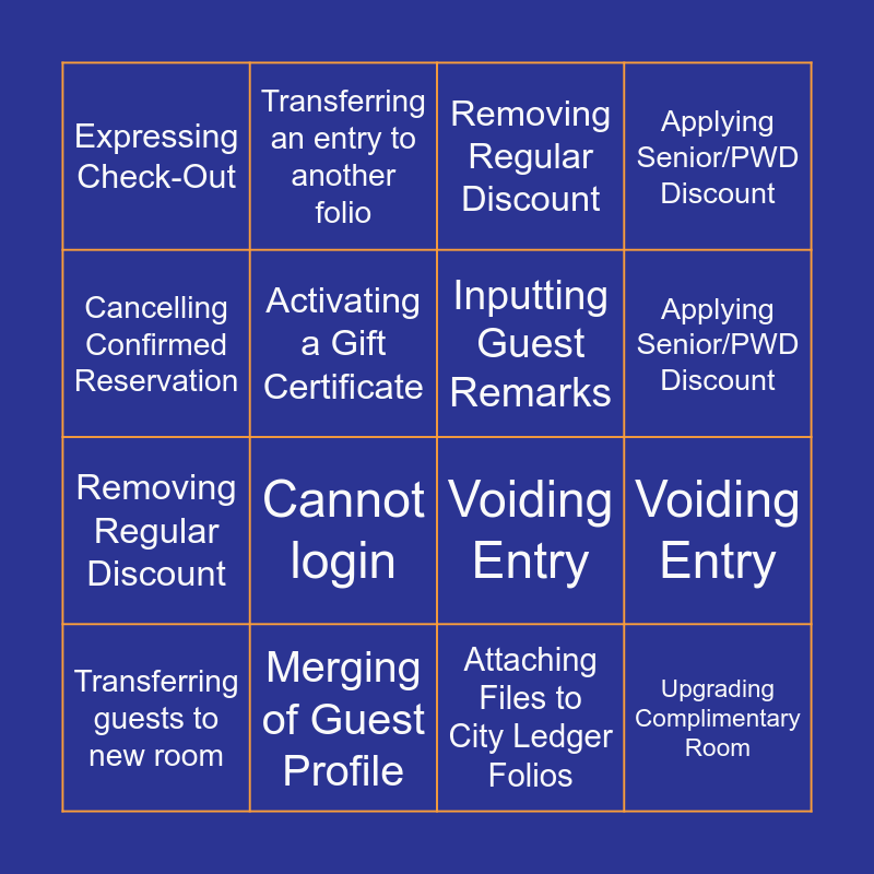 This bingo card has 32 words: Printing Multiple Reg Forms, Reprinting Past Folios, Voiding Entry, Allowing Account for City Ledger, Upgrading Complimentary Room, Inputting Guest Remarks, Cancelling Confirmed Reservation, Attaching Files to City Ledger Folios, Transferring an entry to another folio, Transferring guests to new room, Applying Senior/PWD Discount, Removing Regular Discount, Activating a Gift Certificate, Expressing Check-Out, Merging of Guest Profile, Printing Multiple Reg Forms, Reprinting Past Folios, Voiding Entry, Allowing Account for City Ledger, Upgrading Complimentary Room, Inputting Guest Remarks, Cancelling Confirmed Reservation, Attaching Files to City Ledger Folios, Transferring an entry to another folio, Transferring guests to new room, Applying Senior/PWD Discount, Removing Regular Discount, Activating a Gift Certificate, Expressing Check-Out, Merging of Guest Profile, Updating the system and Cannot login.