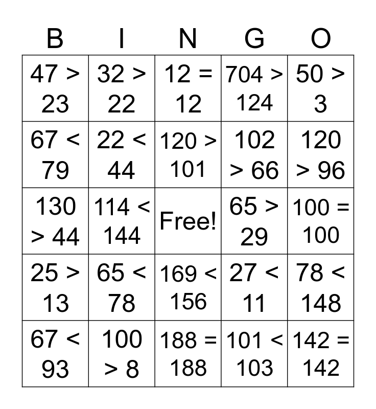 This bingo card has a free space and 29 words: 35 > 13, 100 > 8, 12 = 12, 90 < 99, 50 > 3, 47 > 23, 22 < 44, 120 > 101, 65 > 29, 78 < 148, 67 < 93, 114 < 144, 101 < 103, 142 = 142, 130 > 44, 109 > 100, 188 = 188, 27 < 11, 120 > 96, 25 > 13, 65 < 78, 119 > 112, 102 > 66, 100 = 100, 67 < 79, 32 > 22, 169 < 156, 704 > 124 and 869 > 123.