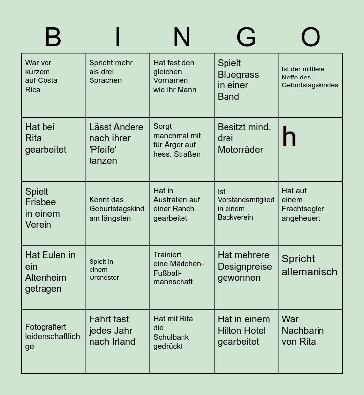 This bingo card has a free space and 24 words: Fotografiert leidenschaftlich ge, Spielt in einem Orchester, Sorgt manchmal mit für Ärger auf hess. Straßen, Hat in einem Hilton Hotel gearbeitet, Ist der mittlere Neffe des Geburtstagskindes, War vor kurzem auf Costa Rica, Spricht mehr als drei Sprachen, Hat fast den gleichen Vornamen wie ihr Mann, Ist Vorstandsmitglied in einem Backverein, Hat auf einem Frachtsegler angeheuert, Spielt Frisbee in einem Verein, Lässt Andere nach ihrer 'Pfeife' tanzen, Hat mehrere Designpreise gewonnen, Spricht allemanisch, Hat bei Rita gearbeitet, Fährt fast jedes Jahr nach Irland, Hat mit Rita die Schulbank gedrückt, Spielt Bluegrass in einer Band, h, Hat Eulen in ein Altenheim getragen, Kennt das Geburtstagskind am längsten, Trainiert eine Mädchen- Fußball- mannschaft, Besitzt mind. drei Motorräder and War Nachbarin von Rita.