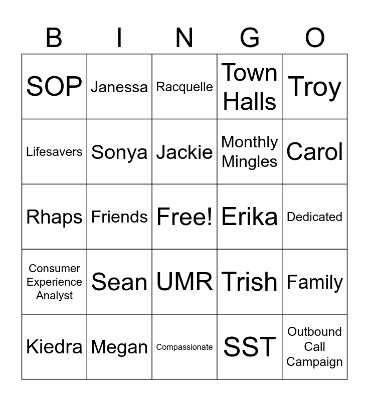 This bingo card has a free space and 34 words: IFP, SST, Tiny BUT Mighty, UnitedHealthcare, Consumer Experience Analyst, Sonya, Troy, Kiedra, Janessa, Veronica, Jackie, Racquelle, Chelle, Janisha, Erika, Carol, Megan, Rhaps, Sean, Trish, UMR, F&F, SOP, Dedicated, Compassionate, Outbound Call Campaign, Town Halls, Team Huddles, Monthly Mingles, Lifesavers, Listeners, Friends, Family and Sonya's dolls.