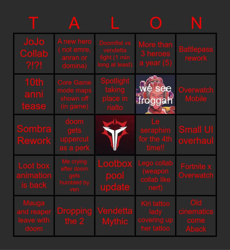 This bingo card has 1 images, a free space and 24 words: Mauga and reaper leave with doom, Me crying after doom gets humbled by ven, Spotlight taking place in rialto, Kiri tattoo lady covering up her tattoo, Battlepass rework, JoJo Collab ?!?!, A new hero ( not emre, anran or domina), Doomfist vs vendetta fight (1 min long at least), Le seraphim for the 4th time!!, Small UI overhaul, Sombra Rework, Core Game mode maps shown off (in game), Lego collab (weapon collab like nerf), Fortnite x Overwatch, 10th anni tease, Dropping the 2, Vendetta Mythic, More than 3 heroes a year (5), Overwatch Mobile, Loot box animation is back, doom gets uppercut as a perk, Lootbox pool update, we see froggah and Old cinematics come Aback.