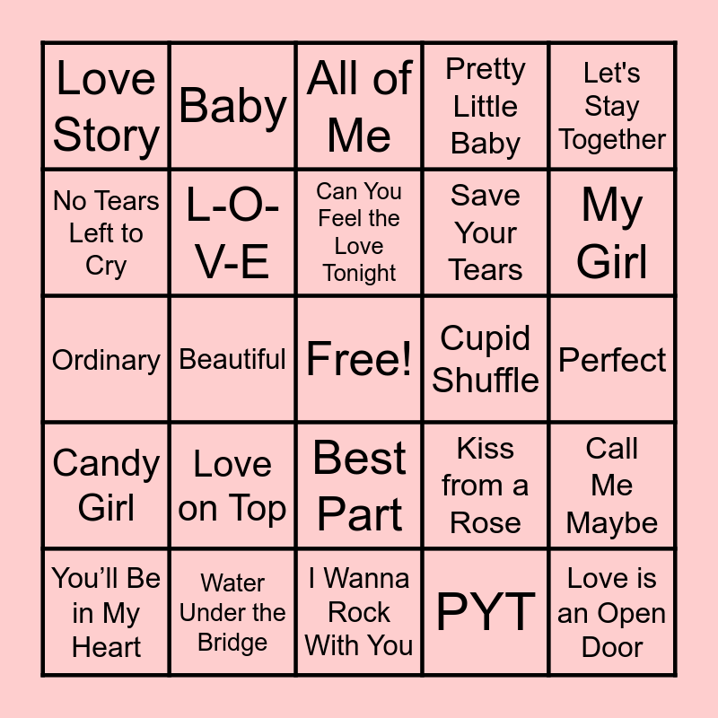 This bingo card has a free space and 42 words: Take My Breath Away, Can You Feel the Love Tonight, At Last, Love on Top, PYT, Call Me Maybe, Love is an Open Door, Lose Control, All of Me, Best Part, Perfect, My Girl, Beautiful, Let's Stay Together, I Will Always Love You, Kiss from a Rose, I Don't Want to Miss a Thing, Ordinary, Soda Pop, Baby, No Tears Left to Cry, Thank U, Next, My Heart Will Go On, Love Story, In My Feelings, Stay, Save Your Tears, Speechless, Crazy in Love, Love, I Got You, Babe, Candy Girl, L-O-V-E, I Wanna Rock With You, Sweet Love, You’ll Be in My Heart, Water Under the Bridge, Cupid Shuffle, Together Forever, Dreams, Pretty Little Baby and Die with a Smile.