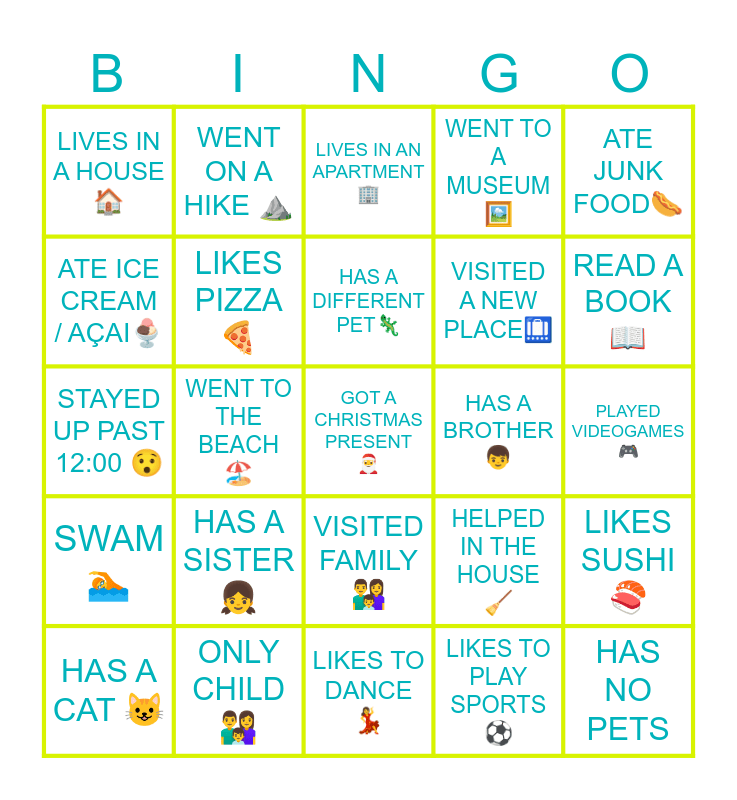 This bingo card has a free space and 29 words: HAS A CAT 😺, HAS A DOG🐶, WENT TO THE BEACH🏖️, WENT TO THE CINEMA🎟️, LIVES IN A HOUSE 🏠, LIVES IN AN APARTMENT🏢, LIKES PIZZA🍕, HAS A SISTER👧, HAS A BROTHER👦, ONLY CHILD👨👩👦, PLAYED VIDEOGAMES🎮, HAS NO PETS, LIKES TO DANCE💃, LIKES TO PLAY SPORTS ⚽, READ A BOOK📖, RODE A HORSE🐎, VISITED FAMILY 👨👩👦, SWAM🏊, ATE JUNK FOOD🌭, STAYED UP PAST 12:00 😯, HELPED IN THE HOUSE🧹, WENT TO A POOL💦, VISITED A NEW PLACE🛄, ATE ICE CREAM / AÇAI🍨, WENT TO A MUSEUM 🖼️, WENT ON A HIKE ⛰️, LIKES SUSHI🍣, HAS A DIFFERENT PET🦎 and LEARNED SOMETHING NEW💡.