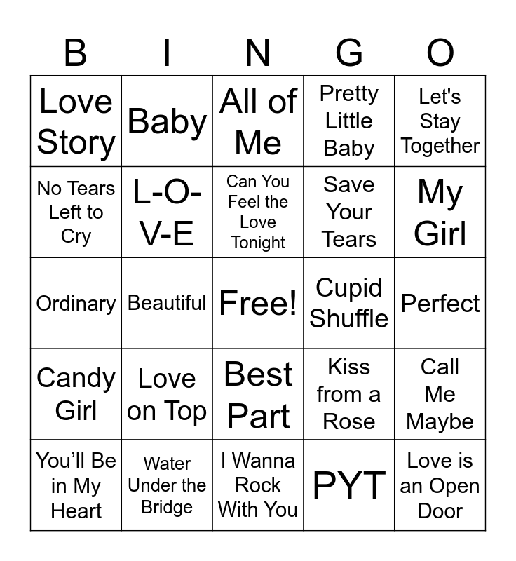 This bingo card has a free space and 42 words: Take My Breath Away, Can You Feel the Love Tonight, At Last, Love on Top, PYT, Call Me Maybe, Love is an Open Door, Lose Control, All of Me, Best Part, Perfect, My Girl, Beautiful, Let's Stay Together, I Will Always Love You, Kiss from a Rose, I Don't Want to Miss a Thing, Ordinary, Soda Pop, Baby, No Tears Left to Cry, Thank U, Next, My Heart Will Go On, Love Story, In My Feelings, Stay, Save Your Tears, Speechless, Crazy in Love, Love, I Got You, Babe, Candy Girl, L-O-V-E, I Wanna Rock With You, Sweet Love, You’ll Be in My Heart, Water Under the Bridge, Cupid Shuffle, Together Forever, Dreams, Pretty Little Baby and Die with a Smile.