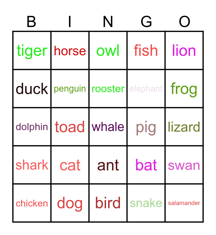 This bingo card has a free space and 24 words: cat, dog, rooster, chicken, lion, tiger, duck, horse, pig, ant, elephant, dolphin, bat, swan, penguin, snake, lizard, owl, frog, toad, salamander, shark, fish and bird.
