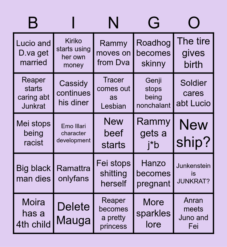 This bingo card has a free space and 24 words: Ramattra onlyfans, Delete Mauga, Tracer comes out as Lesbian, Moira has a 4th child, The tire gives birth, Lucio and D.va get married, Reaper starts caring abt Junkrat, Kiriko starts using her own money, Rammy gets a j*b, Fei stops shitting herself, Genji stops being nonchalant, Mei stops being racist, Hanzo becomes pregnant, Junkenstein is JUNKRAT?, Cassidy continues his diner, More sparkles lore, New ship?, Rammy moves on from Dva, Soldier cares abt Lucio, Emo Illari character development, Anran meets Juno and Fei, Big black man dies, Roadhog becomes skinny and Reaper becomes a pretty princess.