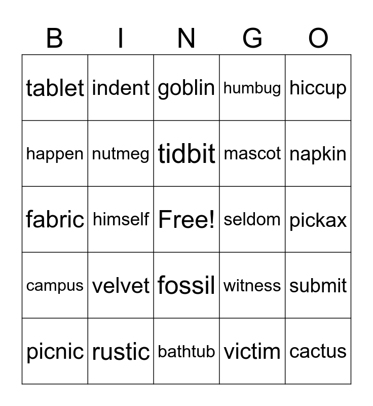 This bingo card has a free space and 24 words: velvet, rustic, tidbit, picnic, hiccup, tablet, happen, indent, seldom, fossil, mascot, fabric, witness, submit, nutmeg, victim, pickax, goblin, napkin, himself, cactus, campus, humbug and bathtub.