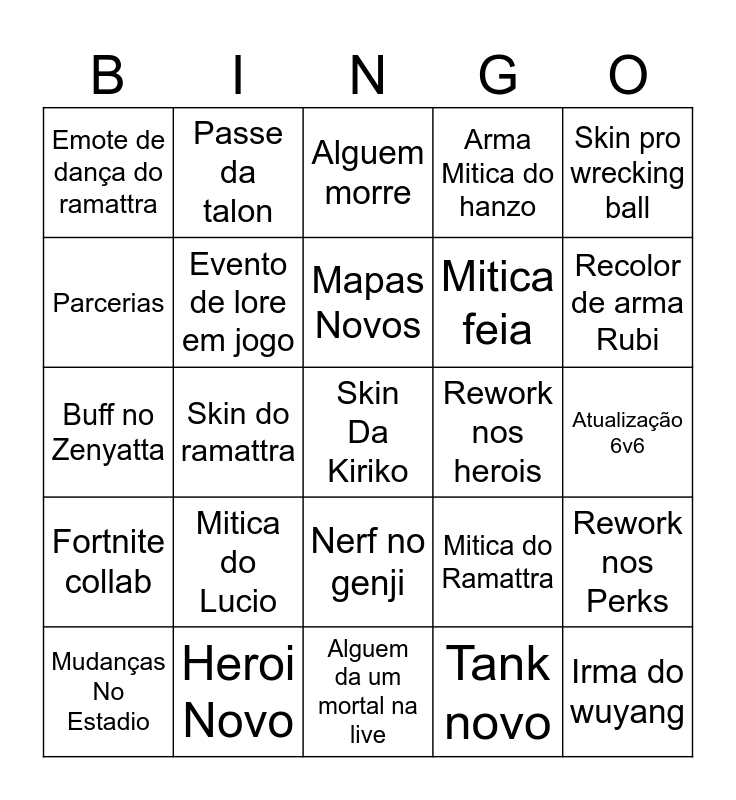 This bingo card has a free space and 24 words: Mitica do Lucio, Heroi Novo, Mapas Novos, Mudanças No Estadio, Skin pro wrecking ball, Emote de dança do ramattra, Parcerias, Passe da talon, Rework nos herois, Nerf no genji, Mitica feia, Buff no Zenyatta, Mitica do Ramattra, Rework nos Perks, Evento de lore em jogo, Tank novo, Atualização 6v6, Alguem morre, Recolor de arma Rubi, Skin do ramattra, Irma do wuyang, Fortnite collab, Arma Mitica do hanzo and Alguem da um mortal na live.