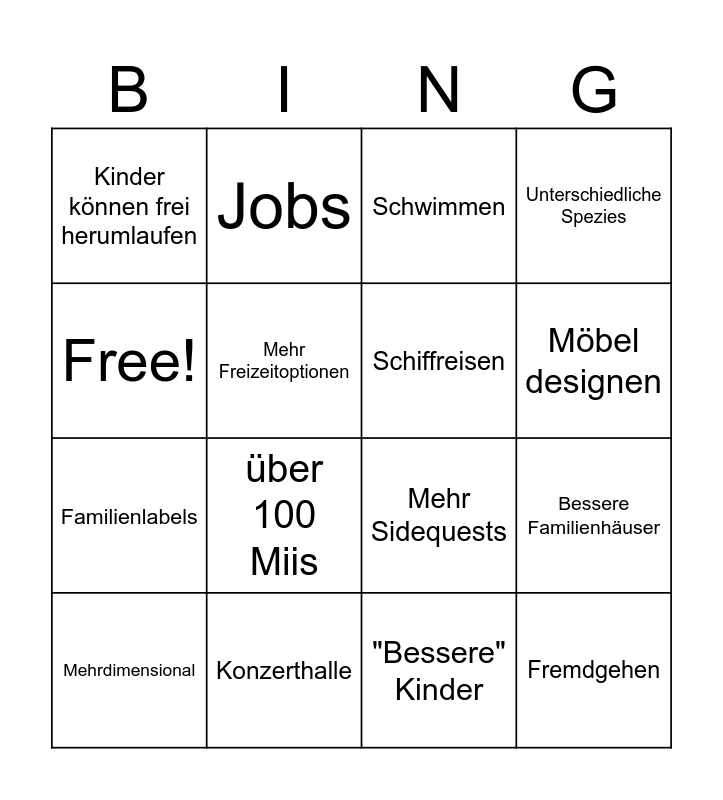 This bingo card has 16 words: Konzerthalle, Bessere Familienhäuser, Schwimmen, Kinder können frei herumlaufen, Familienlabels, Jobs, Mehr Sidequests, "Bessere" Kinder, Free!, Mehr Freizeitoptionen, Mehrdimensional, Unterschiedliche Spezies, über 100 Miis, Möbel designen, Schiffreisen and Fremdgehen.
