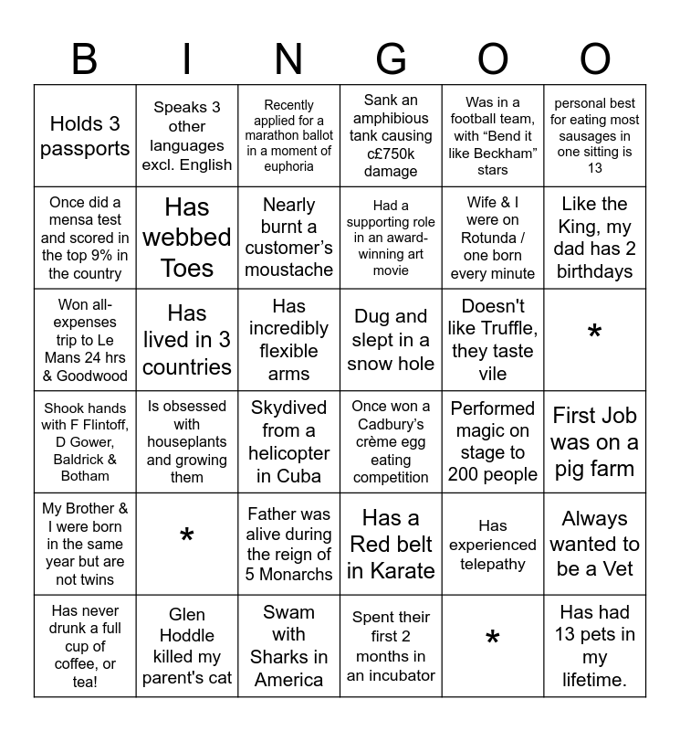 This bingo card has 36 words: Has a Red belt in Karate, Father was alive during the reign of 5 Monarchs, Spent their first 2 months in an incubator, Once did a mensa test and scored in the top 9% in the country, Shook hands with F Flintoff, D Gower, Baldrick & Botham, Dug and slept in a snow hole, Has webbed Toes, Swam with Sharks in America, Was in a football team, with “Bend it like Beckham” stars, Has experienced telepathy, Like the King, my dad has 2 birthdays, Sank an amphibious tank causing c£750k damage, Always wanted to be a Vet, Has lived in 3 countries, Had a supporting role in an award-winning art movie, Holds 3 passports, My Brother & I were born in the same year but are not twins, Doesn't like Truffle, they taste vile, Won all-expenses trip to Le Mans 24 hrs & Goodwood, Recently applied for a marathon ballot in a moment of euphoria, Has incredibly flexible arms, Is obsessed with houseplants and growing them, Once won a Cadbury’s crème egg eating competition, Skydived from a helicopter in Cuba, Performed magic on stage to 200 people, Speaks 3 other languages excl. English, Wife & I were on Rotunda / one born every minute, Glen Hoddle killed my parent's cat, Nearly burnt a customer’s moustache, personal best for eating most sausages in one sitting is 13, Has had 13 pets in my lifetime., Has never drunk a full cup of coffee, or tea!, First Job was on a pig farm, *, * and *.