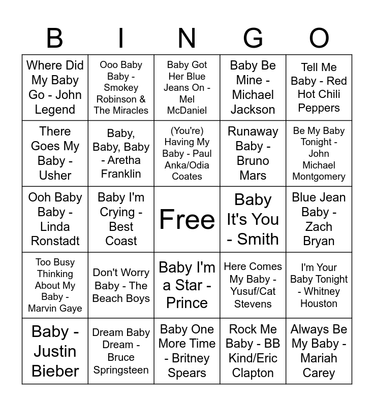 This bingo card has a free space and 51 words: Baby Love - The Supremes, Always Be My Baby - Mariah Carey, Baby Got Back - Sir Mix Alot, Baby One More Time - Britney Spears, Don't Worry Baby - The Beach Boys, Somebody's Baby - Jackson Browne, Ooo Baby Baby - Smokey Robinson & The Miracles, Baby Come Back - Player, There Goes My Baby - Usher, Baby Don't Lie - Gwen Stefani, Baby, Baby, Baby - Aretha Franklin, Baby Be Mine - Michael Jackson, I'm Your Baby Tonight - Whitney Houston, Here Comes My Baby - Yusuf/Cat Stevens, Baby Hold On - Eddie Money, Cry Baby Cry - The Beatles, (You're) Having My Baby - Paul Anka/Odia Coates, Baby It's You - Smith, Bye Baby Baby - Frankie Valli & The Four Seasons, Tell Me Baby - Red Hot Chili Peppers, Baby I'm Crying - Best Coast, Rock Me Baby - BB Kind/Eric Clapton, Where Did My Baby Go - John Legend, Runaway Baby - Bruno Mars, Baby Baby - Amy Grant, I'll Be Your Baby Tonight - Bob Dylan, Be My Baby Tonight - John Michael Montgomery, Baby Let Me Take You Home - The Animals, Baby - Justin Bieber, Baby Got Her Blue Jeans On - Mel McDaniel, Baby I Need Your Lovin - The Four Tops, Be My Baby - The Ronettes, There Goes My Baby - The Drifters, American Baby - Dave Matthews Band, Doing It All For My Baby - Huey Lewis & The News, Dream Baby Dream - Bruce Springsteen, Born To Be My Baby - Bon Jovi, Baby Blue - George Strait, I Got You Babe - Sonny & Cher, Baby Grande - Billy Joel, Blue Jean Baby - Zach Bryan, Too Busy Thinking About My Baby - Marvin Gaye, Take Good Care Of My Baby - Bobby Vee, Steppin' Out With My Baby - Fred Astaire, Baby Please Don't Go - Them, Baby It's You - The Shirelles, Ooh Baby Baby - Linda Ronstadt, Baby One More Time - Ed Sheeran, Sweet Baby - Macy Gray, Baby I'm a Star - Prince and Ice-Ice Baby - Vanilla Ice.