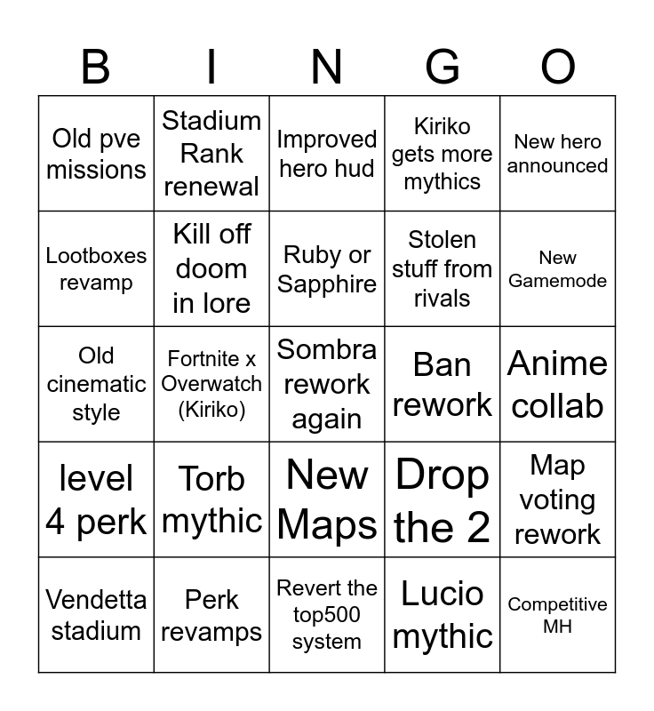 This bingo card has 25 words: Torb mythic, Revert the top500 system, Ruby or Sapphire, Vendetta stadium, New hero announced, Old pve missions, Lootboxes revamp, Stadium Rank renewal, Ban rework, New Maps, Stolen stuff from rivals, Old cinematic style, Drop the 2, Map voting rework, Kill off doom in lore, Competitive MH, Anime collab, Improved hero hud, New Gamemode, Fortnite x Overwatch (Kiriko), Sombra rework again, Perk revamps, level 4 perk, Kiriko gets more mythics and Lucio mythic.